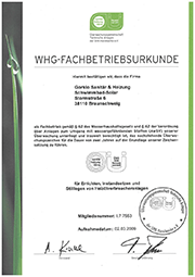 Allgemeine Geschäftsbedingungen (AGB) AGB für Verträge mit privaten Auftraggebern AGB für Werkverträge mit Unternehmern Preise Preisblatt für unsere Reparatur- und Wartungsarbeiten Bescheinigungen SE-BS-Fachbetriebszulassung WHG-Fachbetriebsurkunde